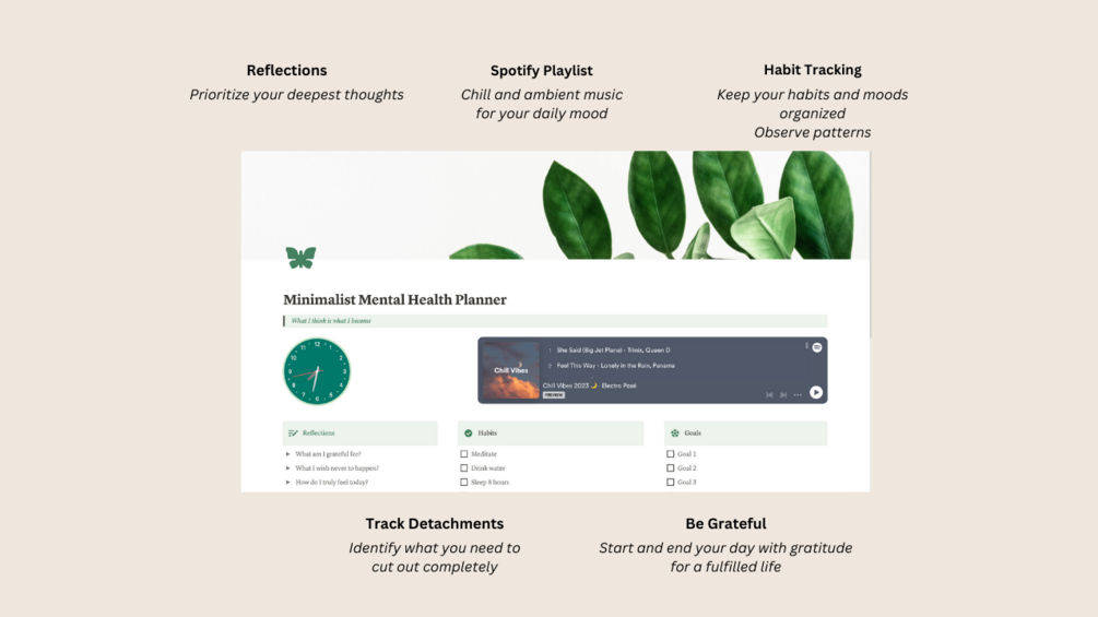 This minimalistic mental health planner will help you monitor and manage your mental health on a daily basis. It typically involves recording your emotions, thoughts, and behaviours in a journal or app throughout the day.